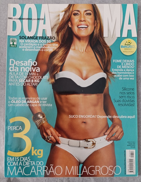 • Revista BOA FORMA  Março de 2012 (Edição nº 303)  Capa Solange FrazãoEstrelando Solange Frazão na virada dos 50 anos, revelando o cardápio e o treino que aceleram o metabolismo e desenham o corpo.Desafio da Noiva: Aula express de 15 minutos combinada com uma dieta com chocolate para secar até 8 kg antes do altar.