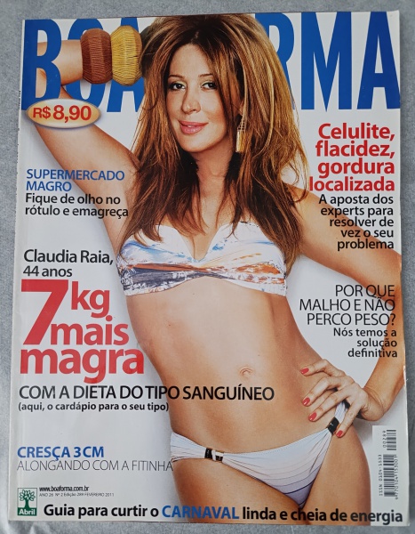 • Revista BOA FORMA  Fevereiro de 2011 (Edição nº 289)  Capa Claudia RaiaEstrelando a atriz Claudia Raia, aos 44 anos, abordando sua rotina de saúde e abordagens nutricionais 1.Emagrecimento: Guia "Supermercado Magro" ensinando a ler rótulos estrategicamente para auxiliar escolhas alimentares.