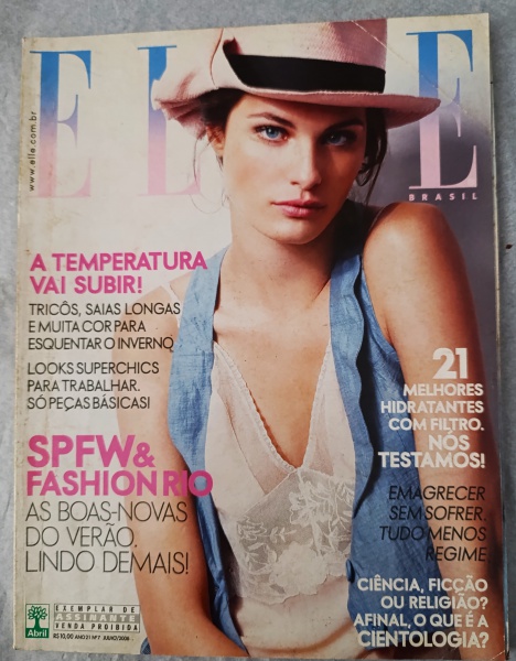 • Revista ELLE Brasil  Julho de 2008  Capa Isabeli FontanaModa de Inverno: Especial com dicas de tricôs, saias longas e cores para aquecer a estação, além de looks "superchics" para o trabalho.Tendências de Verão: As novidades e apostas do SPFW e Fashion Rio para a temporada seguinte.
