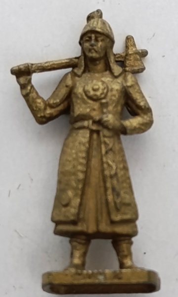 • Miniatura Metal Kinder Ovo Anos 90 - Guerreiro Huno 2 (Vintage)Figura retratada com um machado sobre o ombro e traje de guerra detalhado.
