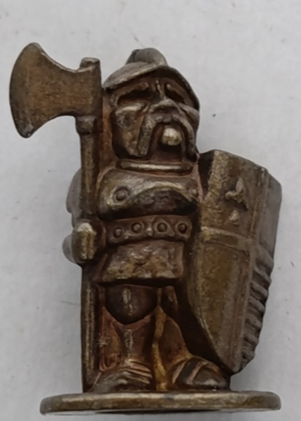 • Miniatura de Metal Kinder Ovo Anos 90 - Soldado Medieval (Peão)Figura ricamente detalhada com expressão facial característica, segurando um machado de batalha e um escudo grande.