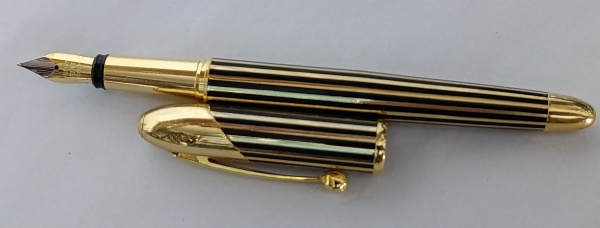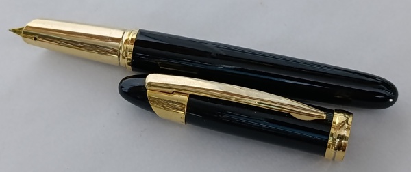 • caneta-tinteiro clássica, um modelo elegante com corpo em laca ou metal preto e detalhes em metal dourado. Peças com este design são frequentemente identificadas com pontas (penas) do tipo "Iridium Point Germany", uma marcação comum em canetas vintage de alta qualidade.