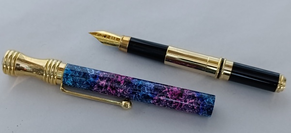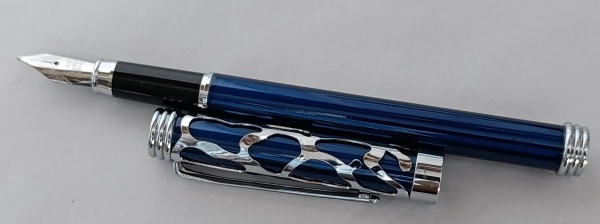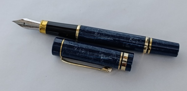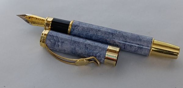 • caneta-tinteiro de coleção com acabamento em resina marmorizada azul e cinza, complementada por detalhes em metal dourado. O modelo é frequentemente identificado em séries editoriais de colecionismo, como a série "Canetas de Colecionador" da editora Salvat (lançada por volta de 1995-1996)