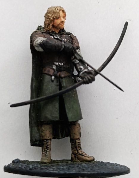 • Miniatura Faramir em Osgiliath - Coleção Senhor dos Anéis (Eaglemoss)Figura detalhada capturando o arqueiro com seu arco longo, armadura característica e capa, sobre uma base temática irregular.
