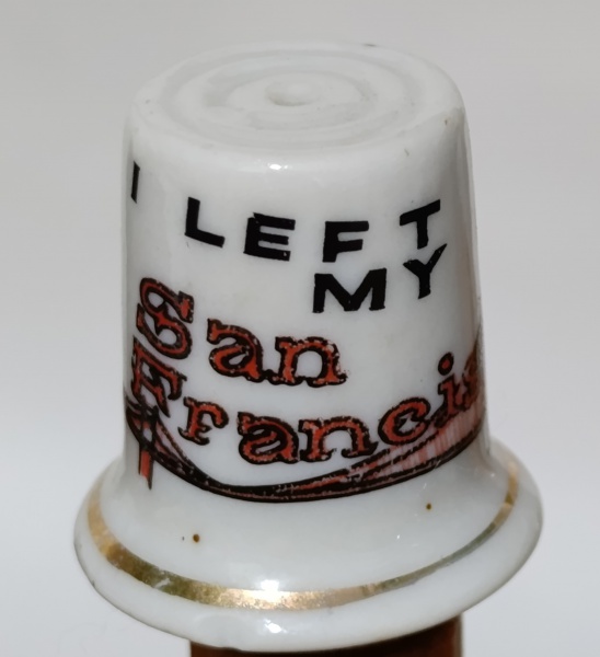 • Dedal Porcelana San Francisco Vintage - "I Left My..." Souvenir Item de colecionador original de San Francisco. Miniatura em porcelana branca com a frase clássica "I Left My San Francisco". Peça vintage em excelente estado de conservação, sem lascas ou trincas. Ideal para coleções de souvenirs geográficos e dedais de viagem.