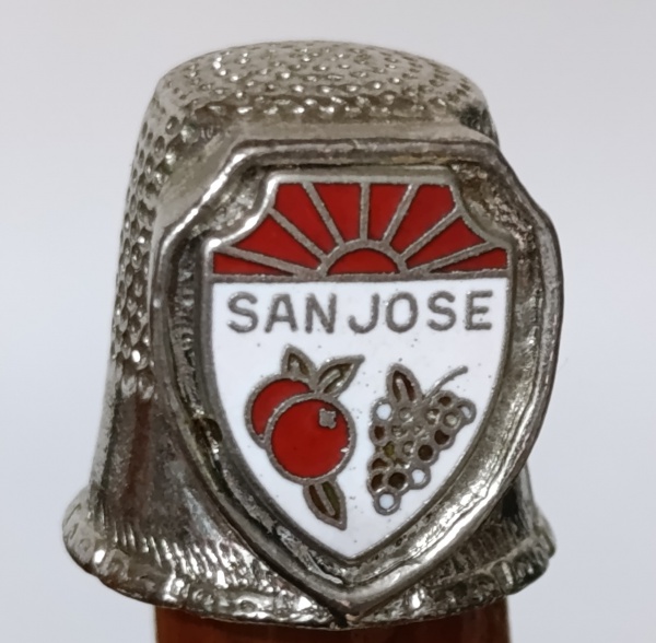 • Dedal Colecionável Souvenir - San Jose, Califórnia - Metal e EsmalteBrasão frontal esmaltado com o nome da cidade e ilustrações de frutas (maçãs e uvas) sob um sol nascente