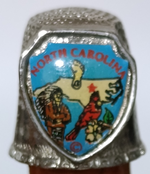 • Dedal de Metal Colecionável Souvenir - North Carolina (Carolina do Norte)Escudo central colorido apresentando o mapa do estado, um cardeal-vermelho (pássaro oficial), a flor do estado (dogwood) e a figura de um nativo americano.