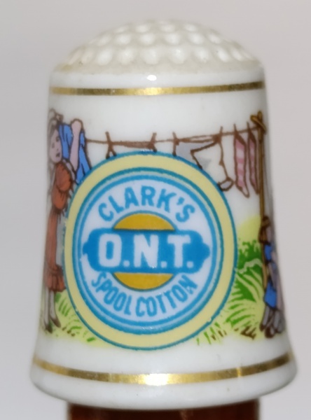 • Apresenta o logotipo circular azul e amarelo da Clark's O.N.T. e uma ilustração detalhada de uma mulher pendurando roupas em um varal ao ar livre.da coleção de dedais de porcelana da Franklin Mint, lançado originalmente em 1980 como parte da série "The Country Store"