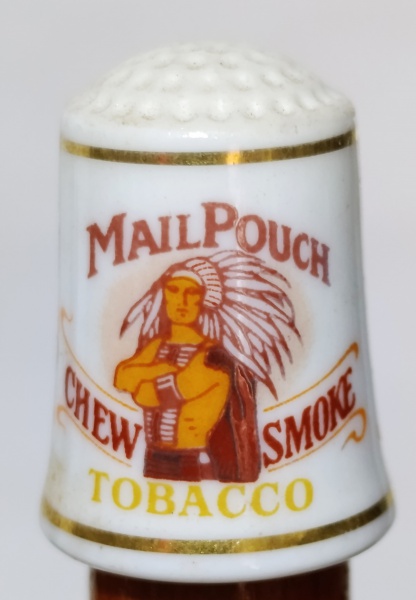 • Dedal de Porcelana Vintage Mail Pouch Tobacco - Franklin Mint 1980 Apresenta a icônica ilustração de um nativo americano com cocar de penas e detalhes em tons de marrom, amarelo e vermelho