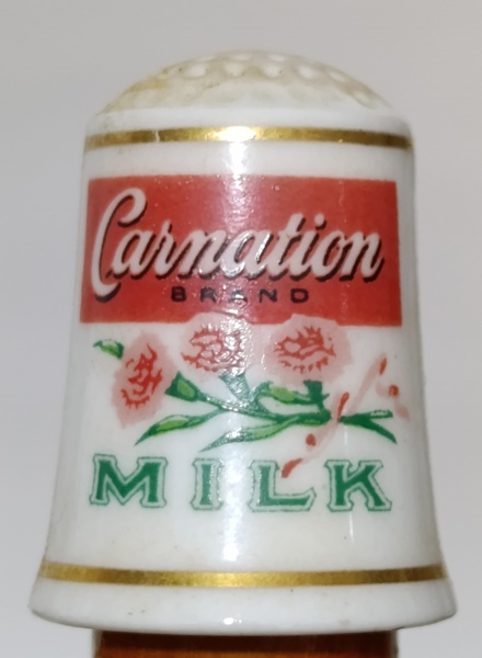 • Dedal de Porcelana Vintage Carnation Milk - Franklin Mint 1980Apresenta o logotipo clássico da Carnation em vermelho e ilustrações detalhadas de flores (cravos) com a inscrição "MILK" em verde.