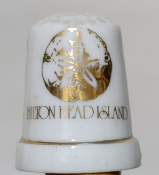 • dedal de porcelana colecionável que serve como uma recordação clássica de viagem (souvenir) de Hilton Head Island, na Carolina do Sul, EUA.