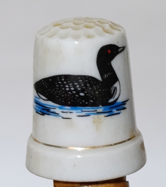 • dedal de porcelana colecionável que serve como uma recordação de viagem (souvenir) da região de Agawa Canyon, em Ontário, Canadá.