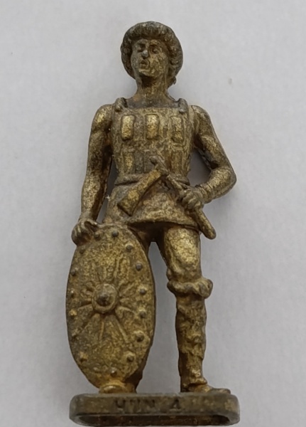 • Miniatura Metal Guerreiro Huno Hun 3 - Kinder Ovo Anos 90 Item de colecionador original da série "Hunos" de 1994 (K95 N109). Miniatura em metal dourado com aproximadamente 4 cm de altura. Peça numerada "HUN 3" na base