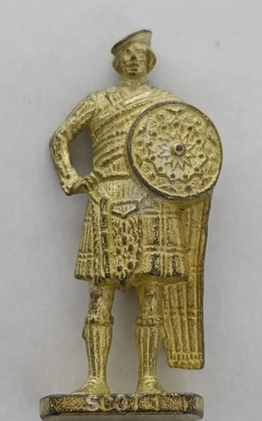 • Miniatura Metal Guerreiro Escocês Scot 1 - Kinder Ovo 1993Item de colecionador original da série "Scots" (K93 N131). Miniatura em metal dourado com aproximadamente 4 cm de altura. Peça numerada "SCOT 1" na base.