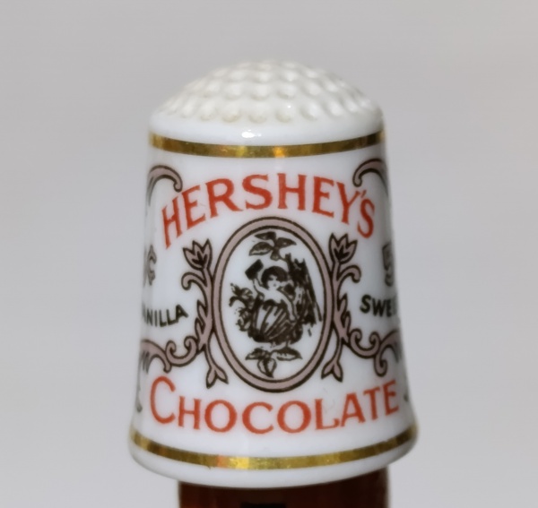 • Dedal Porcelana Hershey's Chocolate Franklin Mint 1980 - Vintage Item original da série "The Country Store" da Franklin Mint, lançada em 1980. Miniatura em porcelana fina com bordas em dourado e publicidade clássica da Hershey's. Peça assinada e datada, em excelente estado de conservação, ideal para colecionadores de dedais e itens de publicidade antiga.