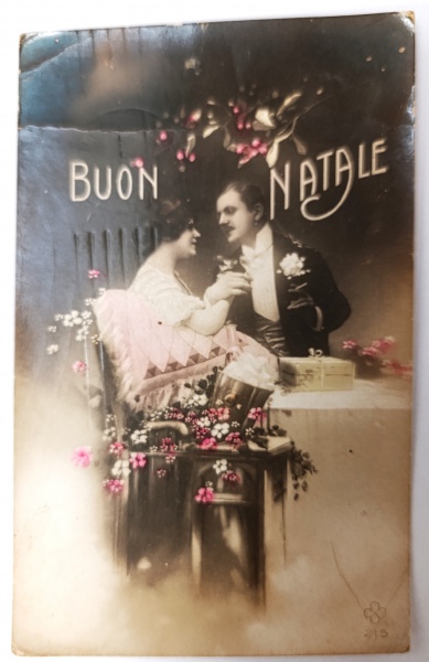 • Antigo Cartão Postal Italiano "Buon Natale"  Casal em Traje de Gala  Fotografia Colorizada à Mão (Circa 1910-1920)