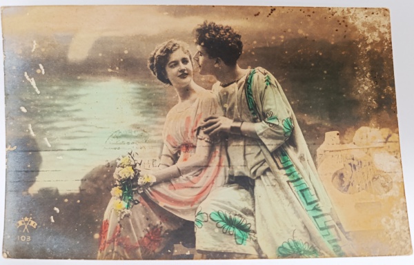 • Raro Cartão Postal Antigo "Cena Clássica"  Estética Greco-Romana  Fotografia Colorizada à Mão (Circa 1900-1915)Raríssimo cartão postal de estúdio que evoca a antiguidade clássica. A cena retrata um casal em trajes que remetem à Grécia ou Roma Antiga, uma temática recorrente na cartofilia artística da Belle Époque, influenciada pelas artes plásticas e pelo teatro da época.
