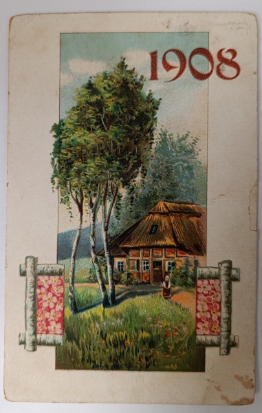• Antigo Cartão Postal "Ano Novo 1908"  Cromolitografia Europeia  Estilo Pastoral e FloralMagnífico cartão postal original de época, celebrando a chegada do ano de 1908. A peça utiliza a técnica de cromolitografia, que proporciona cores vibrantes e uma textura visual rica, típica das editoras de alta qualidade da Alemanha ou Áustria do início do século.