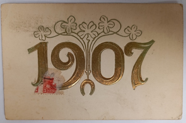 • Antigo Cartão Postal "Ano Novo 1907"  Relevo Dourado  Com Selo Argentino de ÉpocaRaríssimo cartão postal de felicitações para o ano de 1907. A peça é um exemplo primoroso das artes gráficas da virada do século, utilizando técnicas de acabamento que visavam conferir status ao remetente. É um item de grande apelo para colecionadores de "New Year Memorabilia" e história postal.