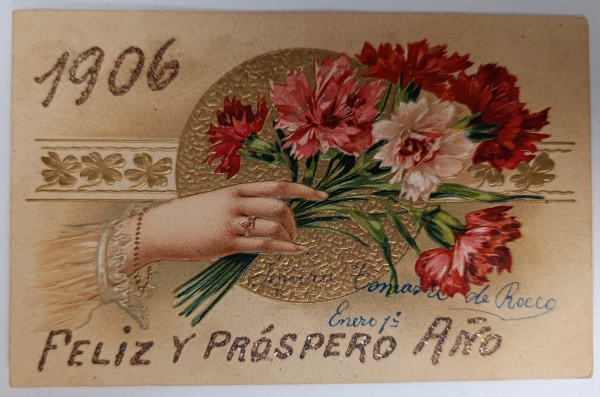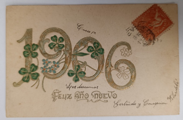 • Antigo Cartão Postal "1906"  Relevo Dourado e Cromolitografia  Mensagem Manuscrita de Época Raríssimo cartão postal de Ano Novo datado de 1º de Janeiro de 1906. Esta peça é um exemplo primoroso da era de ouro dos cartões postais, destacando-se pelo uso de múltiplas técnicas de impressão e acabamento artístico que visavam criar um objeto de desejo e coleção