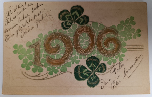 • Antigo Cartão Postal "1906"  Relevo Dourado e Cromolitografia  Símbolos de Sorte (Trevos) e Manuscrito AlemãoRaríssimo exemplar de cartão postal de Ano Novo datado de 1906. Esta peça é um documento único, contendo uma carinhosa mensagem manuscrita em alemão de um pai para seu filho, o que a torna um item de alto interesse para colecionadores de história social e genealogia.