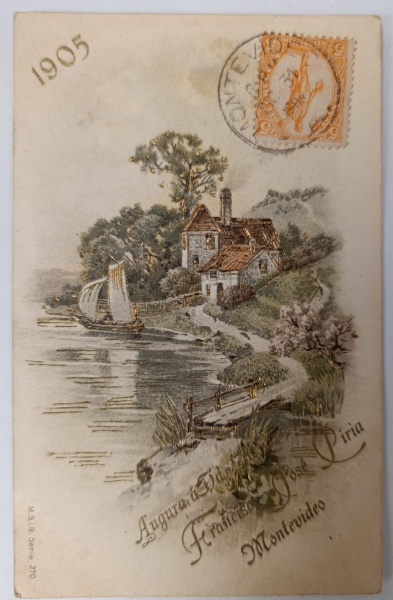 • Raro Postal Circulado (1905)  Francisco Piria / Montevidéu  Paisagem com Glitter e Selo de Época Exemplar raríssimo de cartão postal circulado em agosto de 1905. A peça apresenta uma dedicatória impressa de "Francisco Piria" e "José Piria", nomes ligados à elite empresarial e fundadora do Uruguai. É um item de coleção tripla: atrai cartofílicos, filatelistas e historiadores da região de Montevidéu.