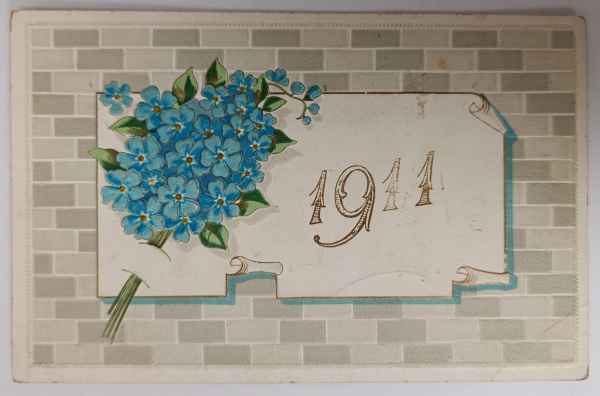 • Antigo Cartão Postal "1911"  Cromolitografia com Relevo  Temática "Não-me-esqueças" (Forget-me-not)Belíssimo cartão postal original de época, celebrando o ano de 1911. A peça utiliza a técnica de cromolitografia com relevo (embossing), conferindo uma textura táctil e profundidade visual que eram o padrão de luxo das grandes editoras europeias do início do século XX.
