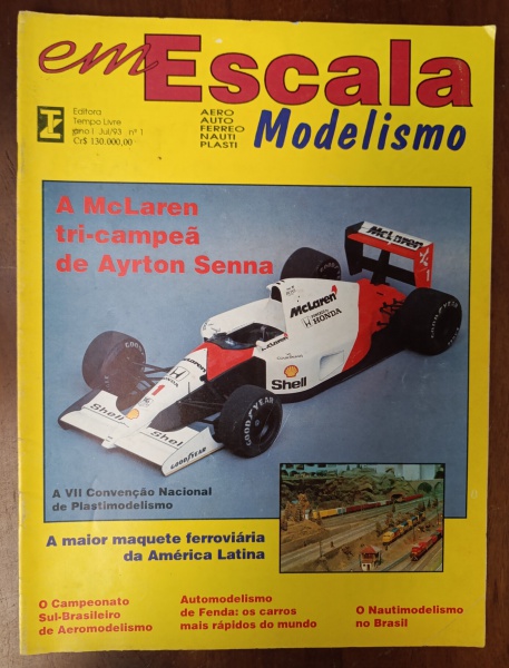 • Revista em Escala Modelismo Nº 1 (Julho/1993) - Edição de Lançamento -  Este exemplar original de julho de 1993 é o número inaugural da revista emEscala, um marco na imprensa especializada do gênero no Brasil. A capa destaca a icônica McLaren MP4/6 de Ayrton Senna, celebrando o tricampeonato do piloto.