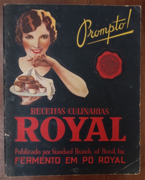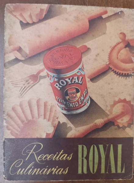 • Antigo Livro de Receitas Culinárias Fermento Royal - Década de 30/40 - "Receitas Culinárias Royal", publicado pela Standard Brands of Brazil Inc. Esta edição específica, com a ilustração clássica de uma lata de fermento cercada por utensílios de cozinha (como o rolo de massa e formas de empada), é altamente colecionável por seu valor histórico e nostálgico.