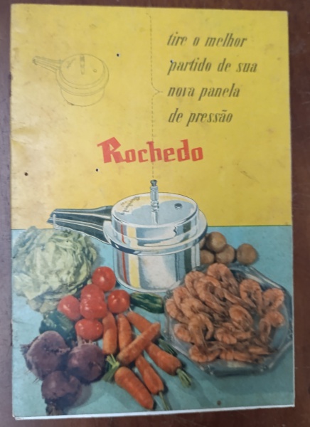 • Raro Livreto de Receitas e Manual Panela de Pressão Rochedo  Vintage (Anos 50/60) - folheto "Tire o melhor partido de sua nova panela de pressão Rochedo", um guia de instruções e receitas que acompanhava as panelas de pressão da marca nas décadas de 1950 e 1960. Este item é uma peça de ephemera culinária muito procurada por colecionadores que possuem as panelas originais de alumínio polido ou que apreciam a estética gráfica de época.