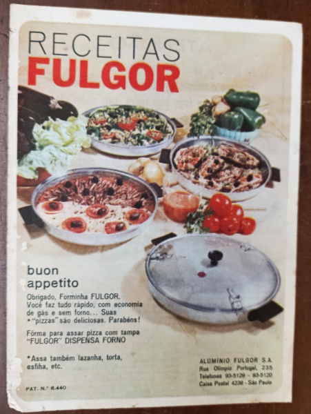• Raro Folheto Antigo de Receitas Fulgor  Colecionismo Vintage (Anos 60/70) -  folheto "Receitas Fulgor", que acompanhava a famosa Fôrma para Pizza e Assados da marca Alumínio Fulgor S.A.. Este item é um clássico da culinária brasileira, especialmente popular nas décadas de 1960 e 1970, por permitir assar pizzas e outros pratos diretamente na boca do fogão, economizando gás.