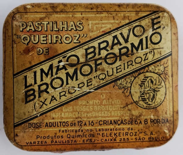 • Lata de Pastilhas Queiroz  Limão Bravo e Bromoformio (Anos 40/50)Lata antiga litografada das famosas Pastilhas Queiroz, fabricadas pelo histórico laboratório "Elekeiroz" S.A. em Várzea Paulista, São Paulo. A peça possui um design gráfico marcante com tipografia em diagonal e o logotipo clássico da engrenagem com as iniciais "EK".