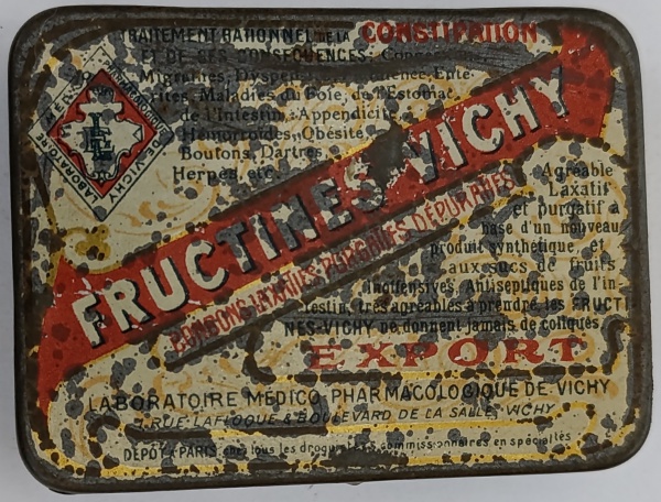 • Lata Francesa Antiga Fructines Vichy  Laxante de Frutas (Anos 30/40)Belíssima lata litografada vintage das Fructines Vichy, produzida pelo Laboratoire Médico-Pharmacologique de Vichy. Esta peça é um item de exportação ("EXPORT"), com textos em francês que detalham sua composição à base de sucos de frutas e sua indicação como um "laxante e purgativo agradável".